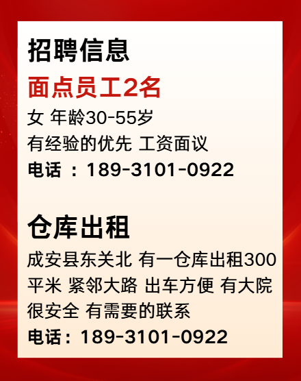 招聘:厨师一名,凉菜一名,工资面议。地址:成安二环路乾侯便民市场
