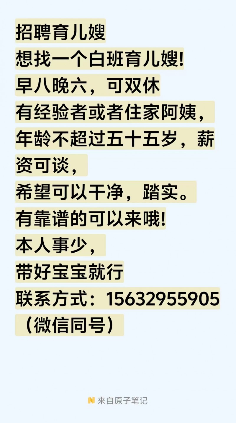 想找一个白班育儿嫂!早八晚六,可双休有经验者或者住家阿姨,年龄不超过五十五岁,薪资可谈,希望可以干净,踏实。有靠谱的可以来哦!本人事少9带好宝宝就行