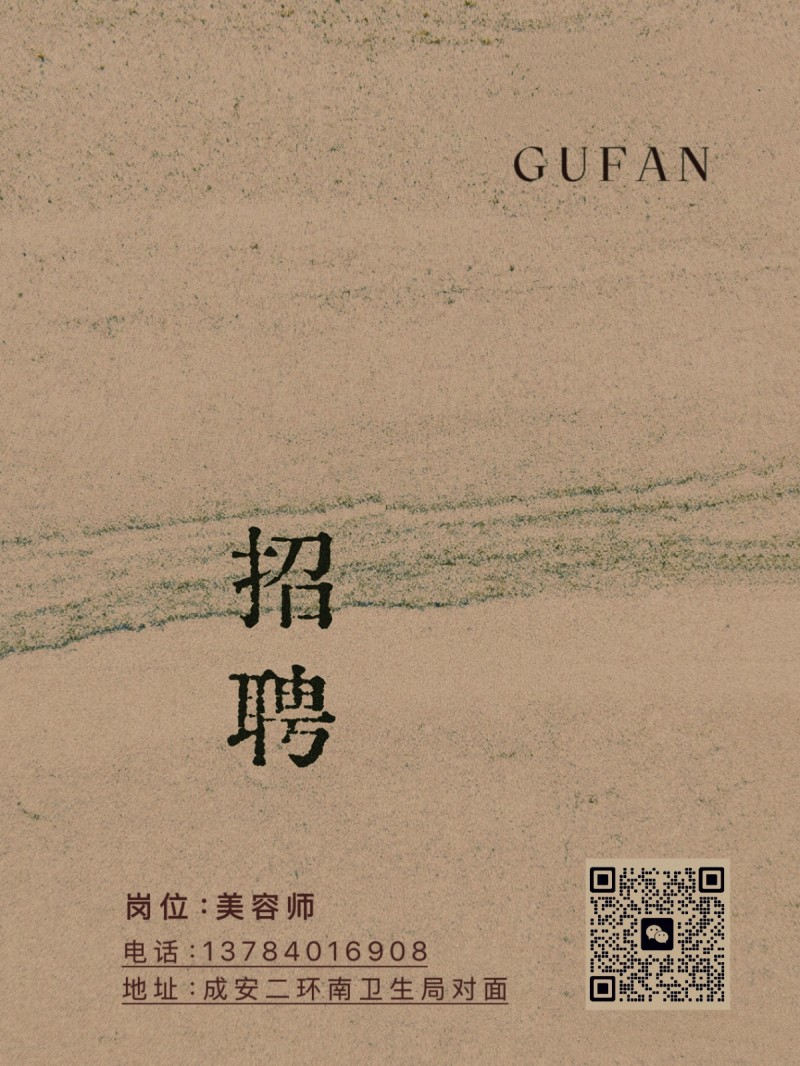 古梵美学研修院 招聘美容师 , 地址:成安二环南卫生局错对面(古梵美学研修院)