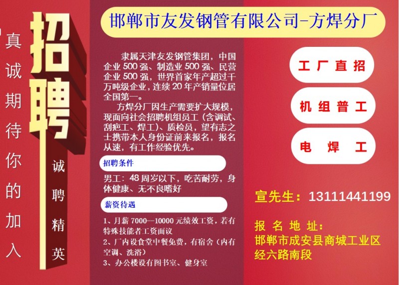 招聘技工 五险一金,午餐免费,住宿免费, 地址:成安县友发钢管(经五街西)