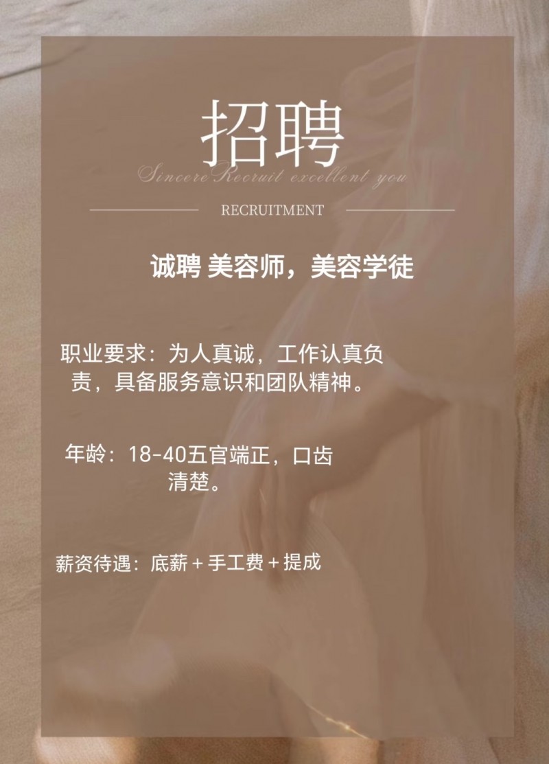 招聘美容师养生师 地址:河北省邯郸市成安县冯民水暖卫浴北侧