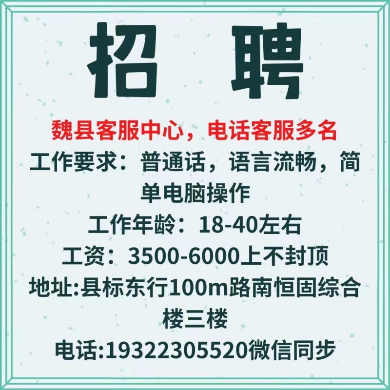 招聘电话客服,业务简单,包培训,月入4000➕,上六休一,福利好,奖品多 地址:河北省邯郸市成安县成安镇西一环上林苑南