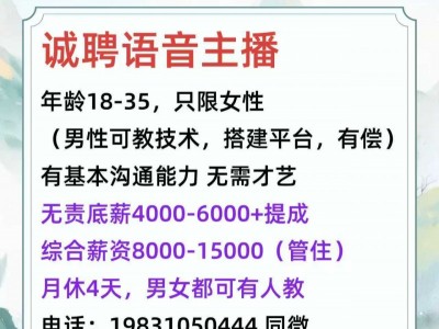 长期招聘主播(只需女性)临时 全职均可 (男性可教技术,有偿)目前在职员工平均工资15000左右 欢迎各界精英的加入 注:有挣钱欲望的联系,不要浪费彼此时间 工作内容: 在平台上与用户进行 打字语音视频聊天,为用户提供情感支持和建议。 聊天内容包括但不限于生活、情感问题、个人见解、美食、旅游等。 维护良好的用户关系,提高用户满意度。 要求:女性,年龄18-35周岁 性格开朗外向,能主动与人沟通交流,形象气质佳,不需要才艺 月薪8000~15000 提供住宿 月休息四天 每天8小时