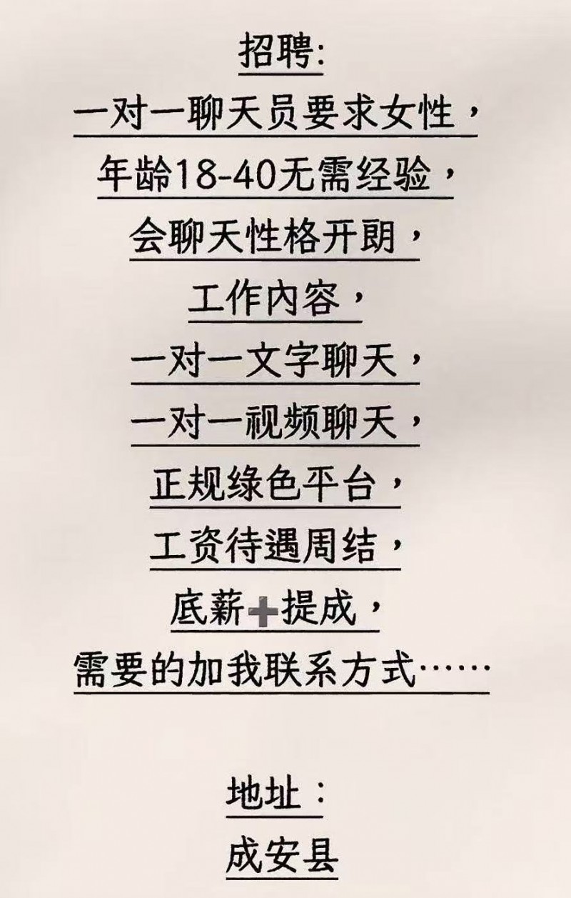 招聘:一对一聊天员要求女性,年龄18-40无需经验,会聊天性格开朗,形象气质佳,工作内容,一对一文字聊天,视频聊天,正规绿色平台,工作内容: 在平台上与用户进行 打字语音视频聊天,为用户提供情感支持和建议。 聊天内容包括但不限于生活、情感问题、个人见解、美食、旅游等。 维护良好的用户关系,提高用户满意度 工资待遇4000底薪加提成 地址:成安县