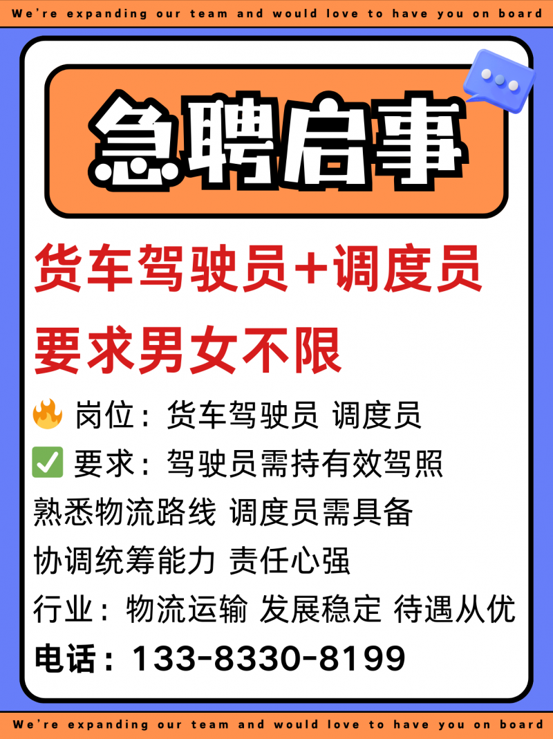 急聘! 货车驾驶员+调度员 男女不限 岗位:货车驾驶员、调度员 ✅ 要求:驾驶员需持有效驾照,熟悉物流路线;调度员需具备协调统筹能力,责任心强 行业:物流运输,发展稳定,待遇从优
